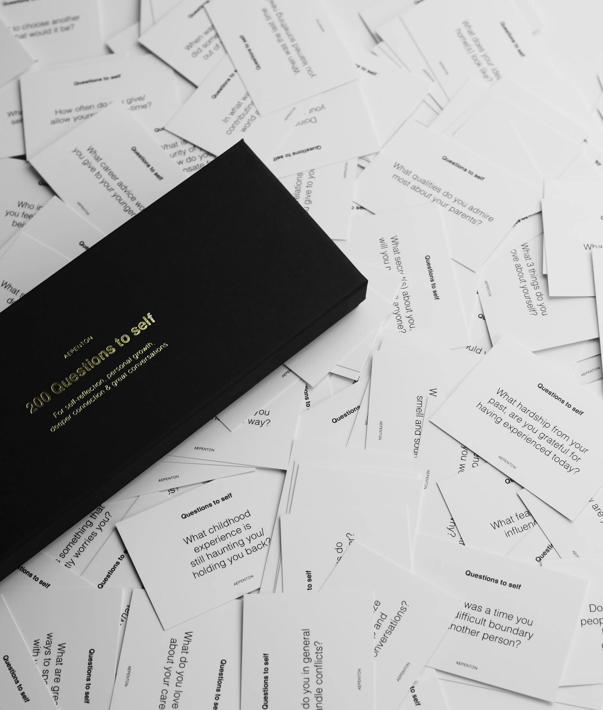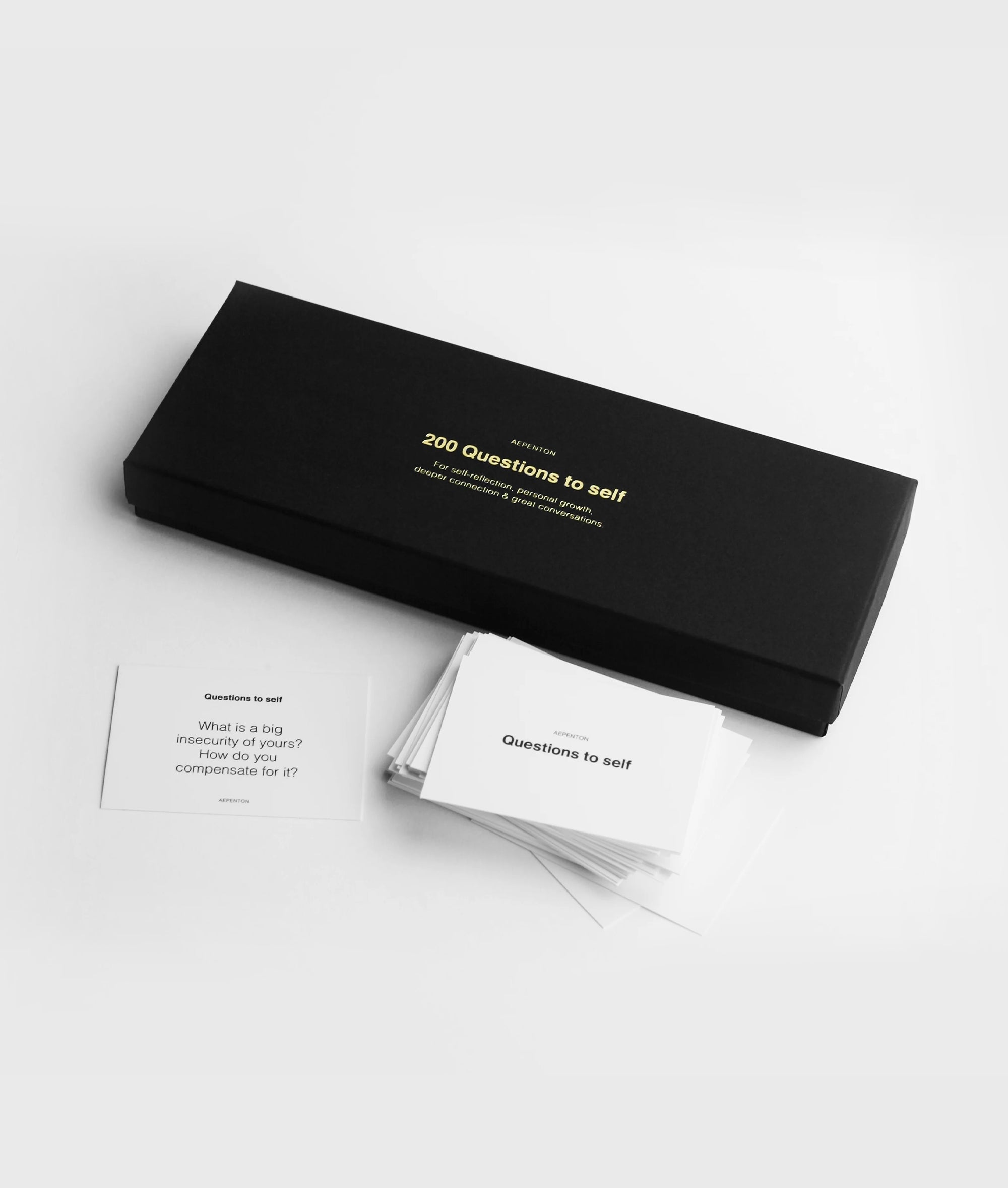A luxury box with 200 questions made to make you think more deeply about various things in your life; career, family, happiness, friendship, goals, ambitions, past, present, future and much more. Use them by yourself for reflection, personal growth, guidance or meditation. Or use them in a group of people to create deeper meaningful conversations, connections and at times great laughs. A note from our creative director Barbara: I love to talk and think about the real things in life. These cards are fun and will make you more conscious. Dimensions: 30 cm x 22.5 cm x 8.5 cm.|