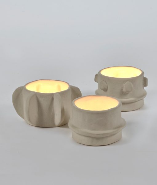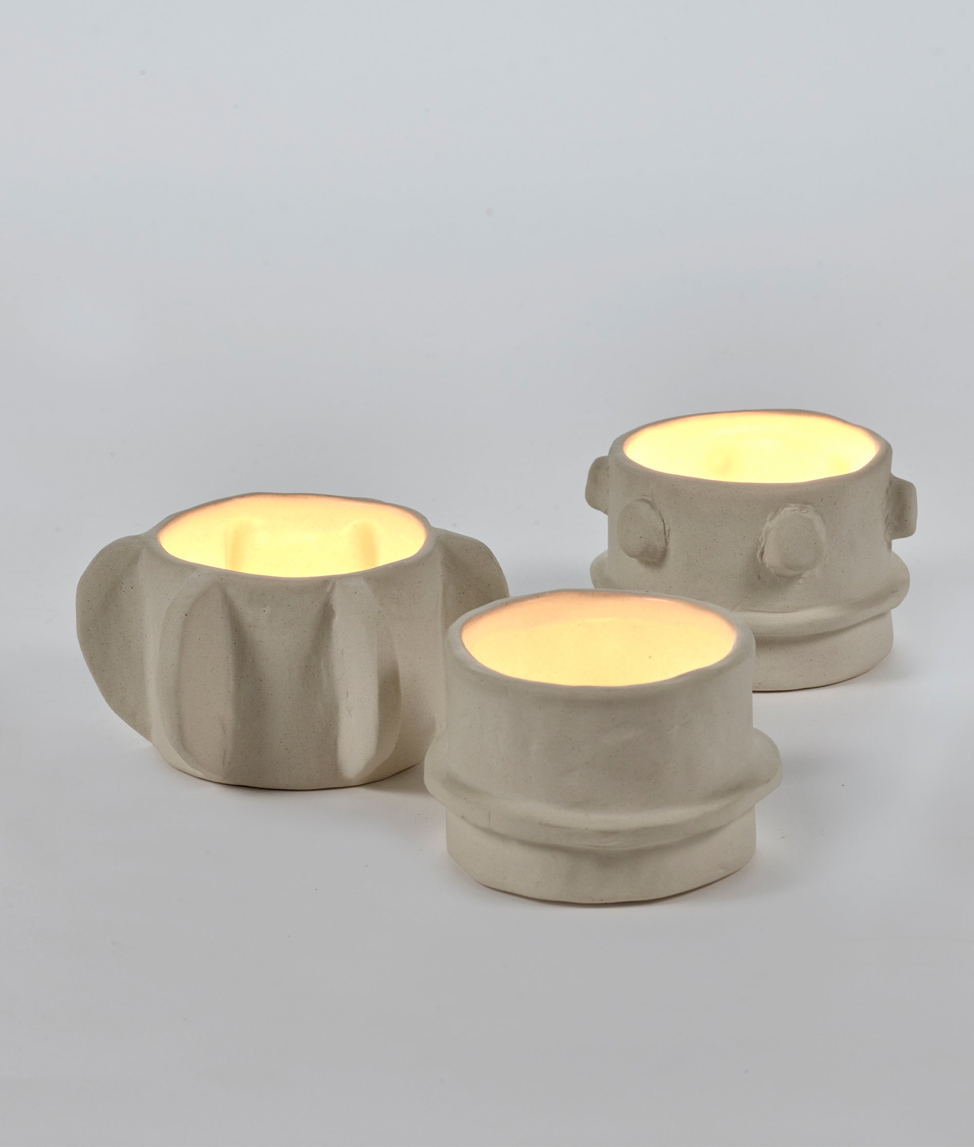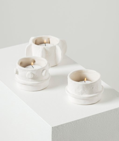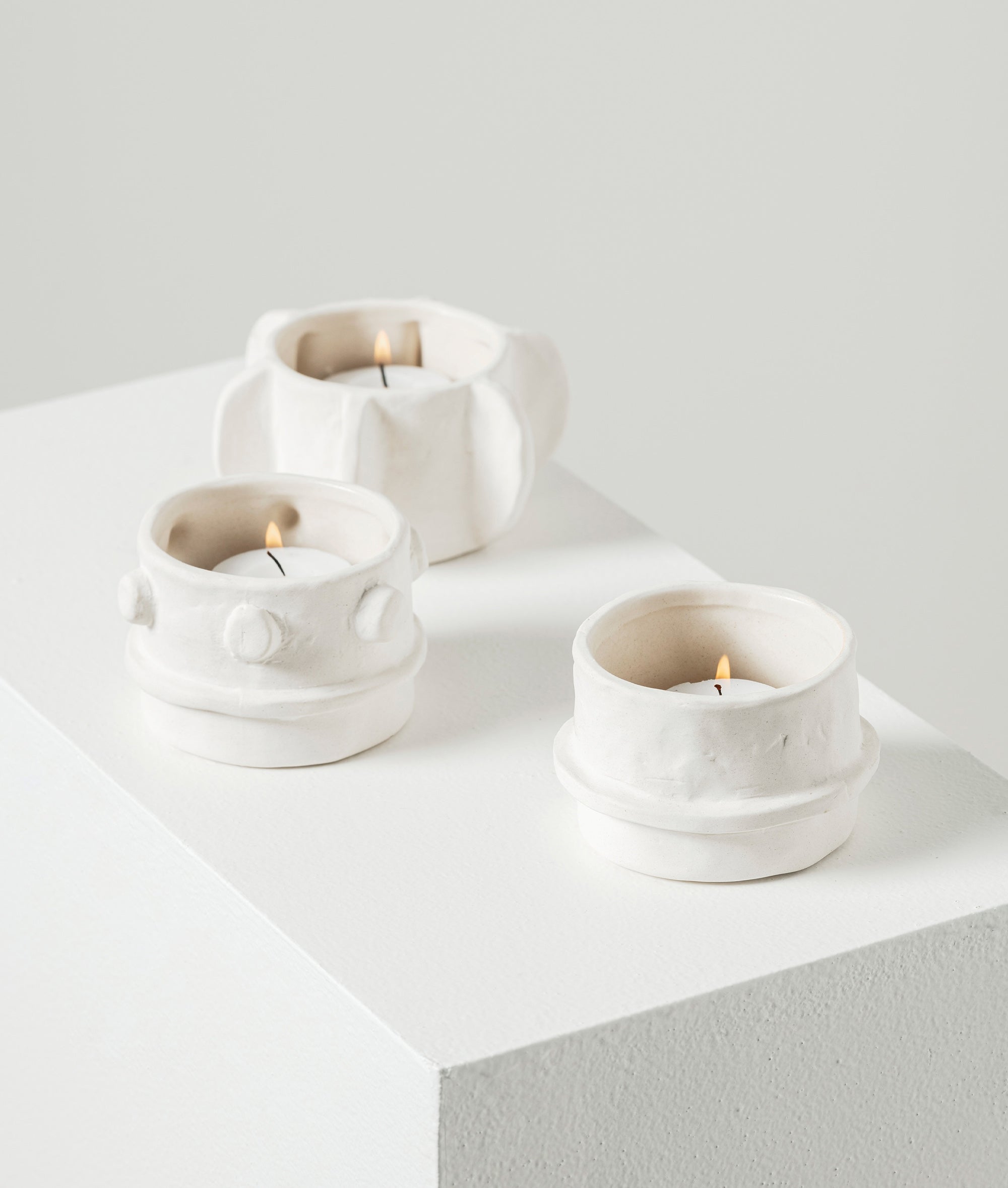Set of 3 Serax 03 Molly tealight holders, designed by Marie Michielssen. The earthenware tealight holders are matt on the outside and glazed on the inside. The tealight holders are finished by hand, making each piece unique. Dimensions: L 8 W 8 H 5 CM.|