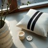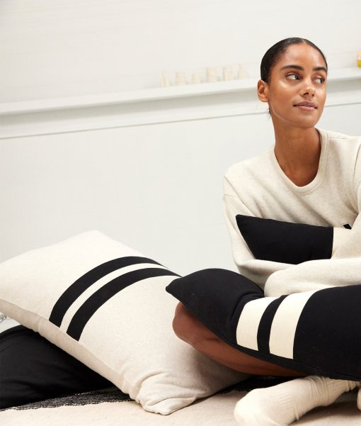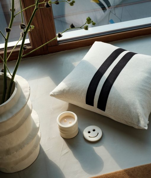 Square cushion cover made from super soft signature 10DAYS babyfleece. Features a zipper, two large vertical herringbone tape stripes on the front and a small label in the side seam. Size: 60 cm x 60 cm.|