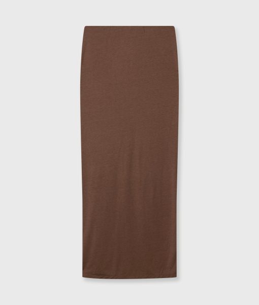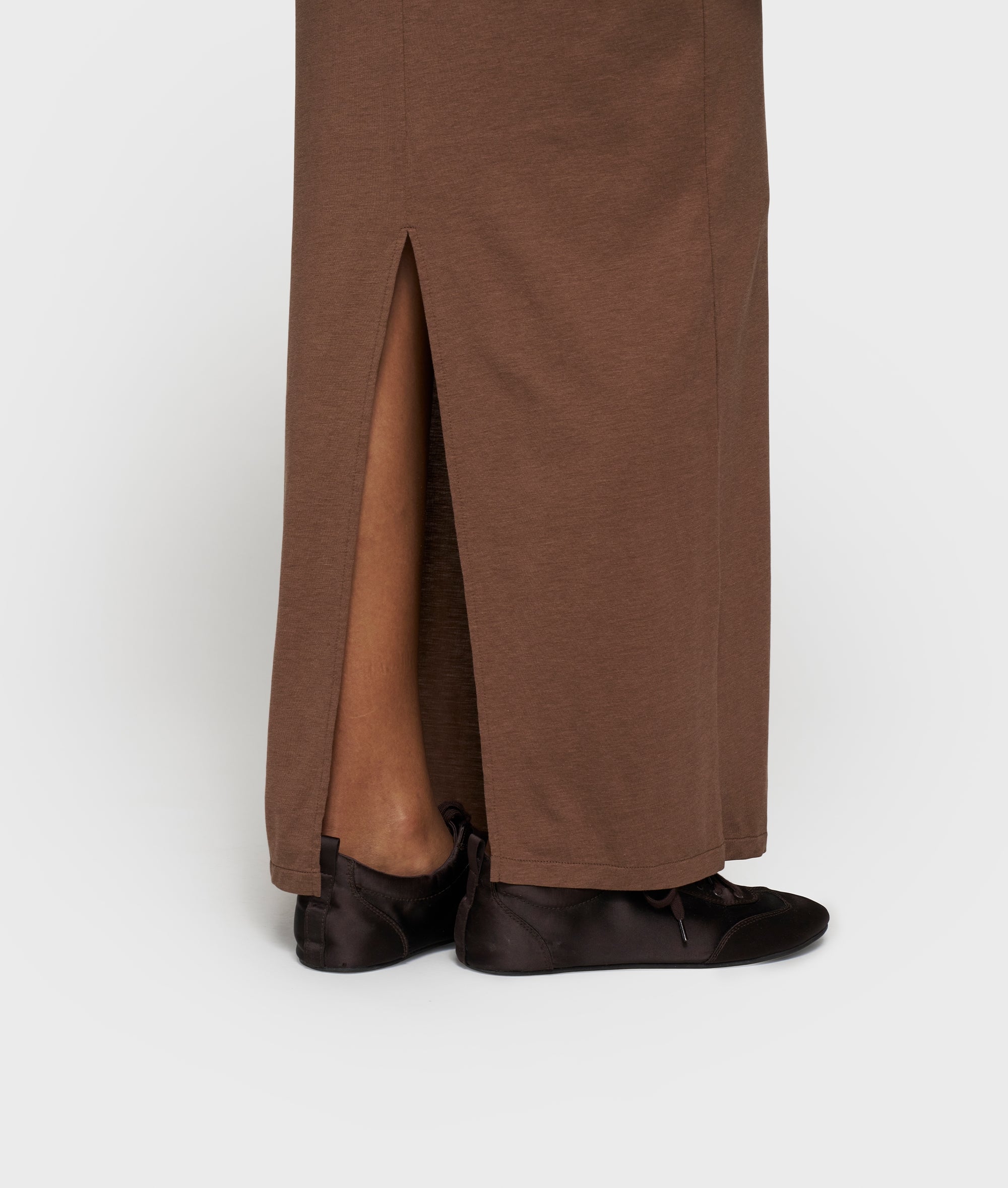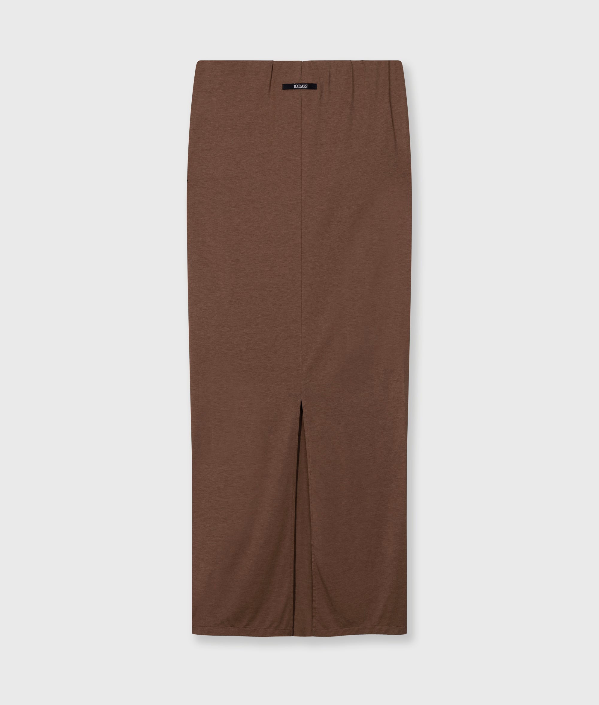Regular fit long skirt made from lyocell jersey with a mid-rise elasticated waistband. Designed with a back slit and finished with a subtle logo detail just below the waistband.|