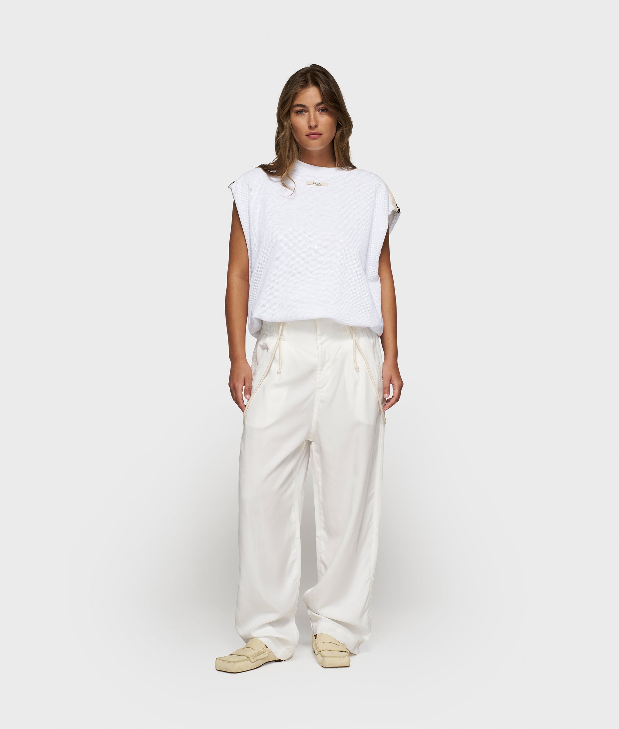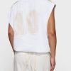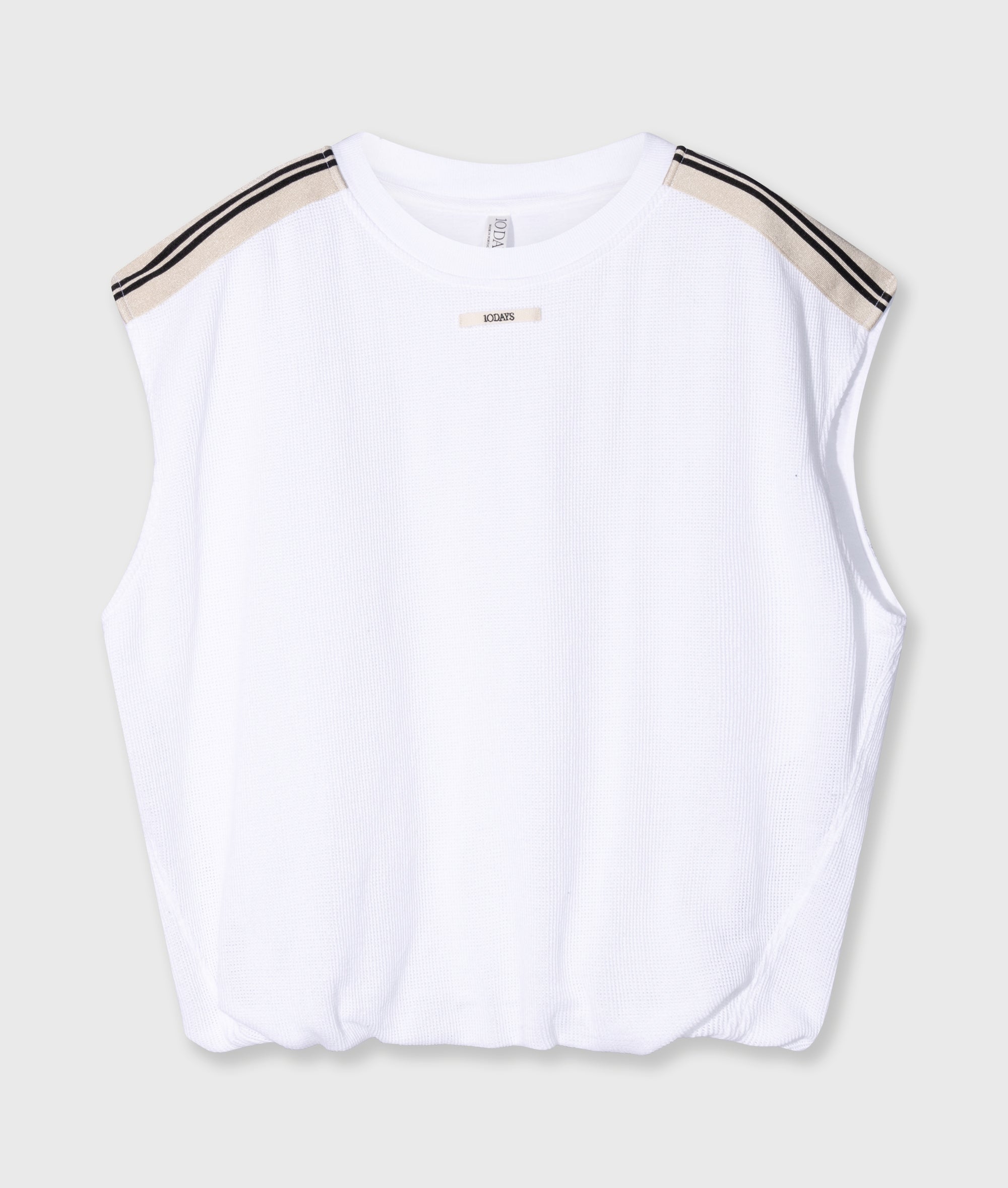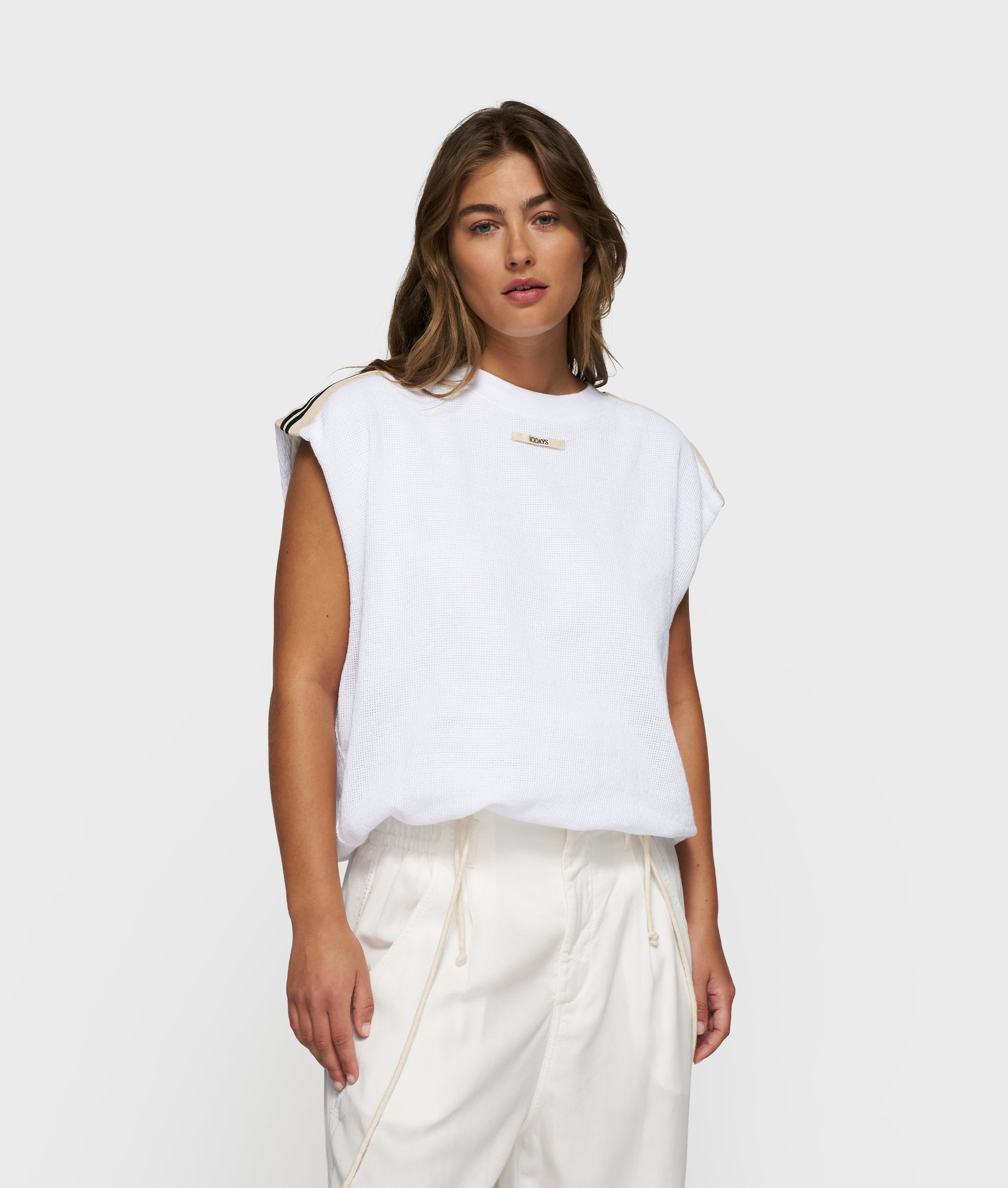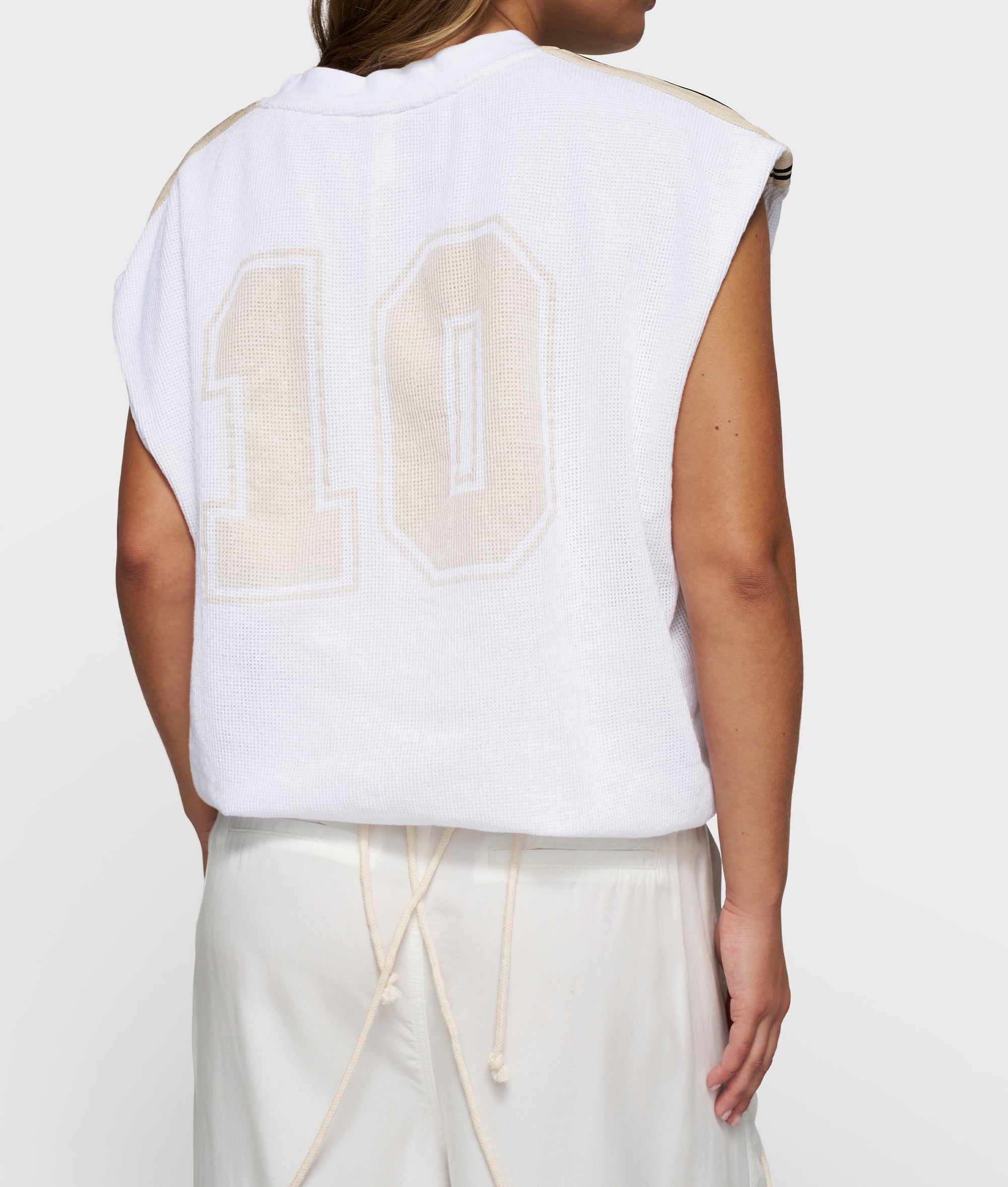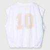 Relaxed fit sleeveless baseball mesh T-shirt made from soft GOTS-certified organic cotton. Designed with striped tapes on the shoulders, a ribbed crew neck, a pleated hem and a ‘baseball 10’ print at the centre back.|