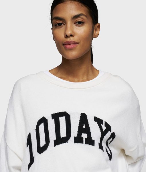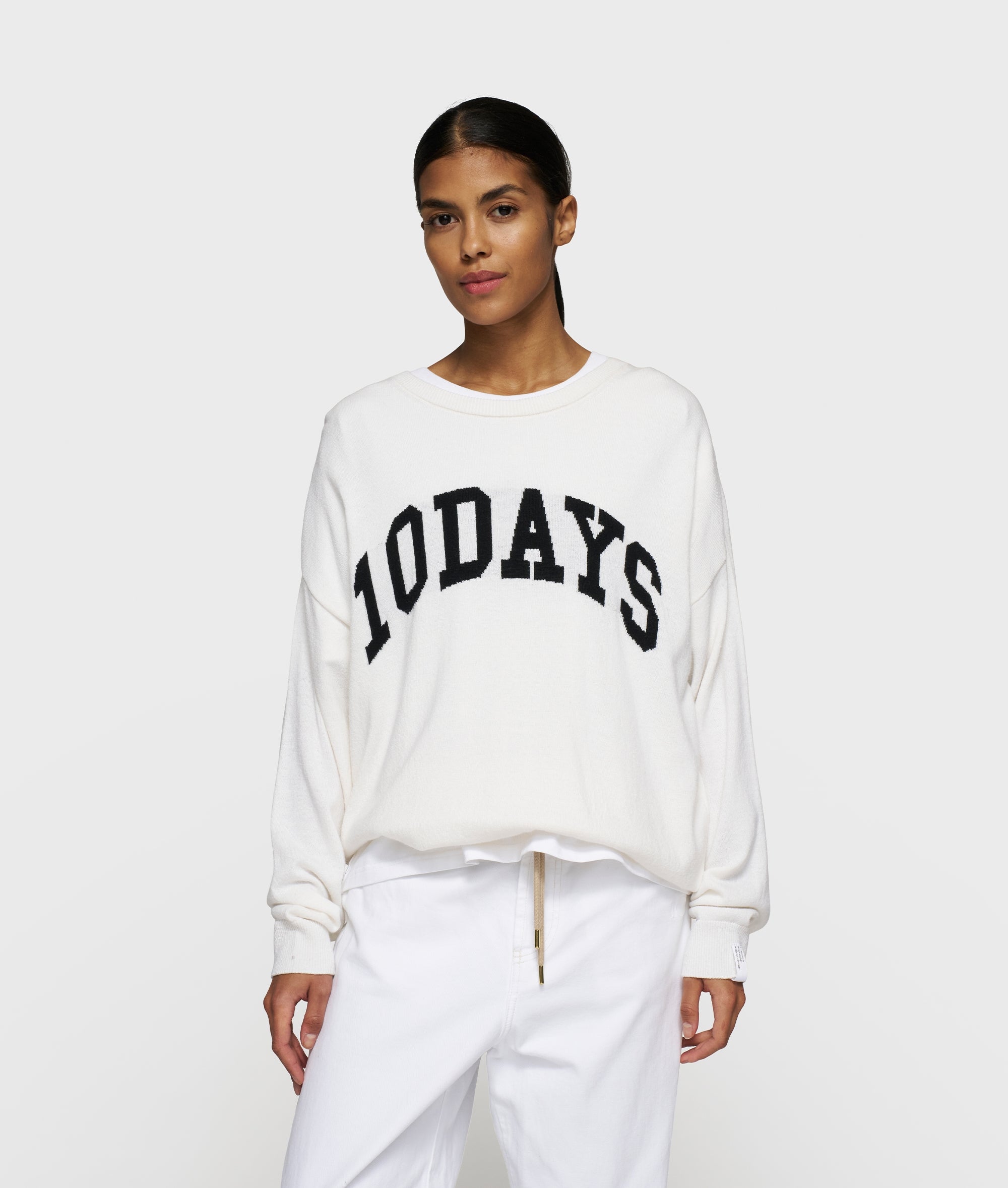 Relaxed fit statement knit sweater with round neck, crafted from a soft cash five knit including wool, viscose and cashmere. Features a rib-knit trim at the hem, sleeves and neckline, ’10DAYS varsity’ woven-in artwork on the front panel and a tagline label on the left sleeve.|