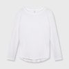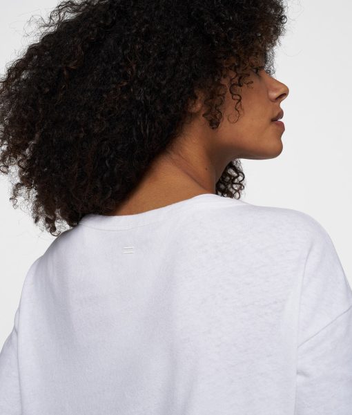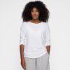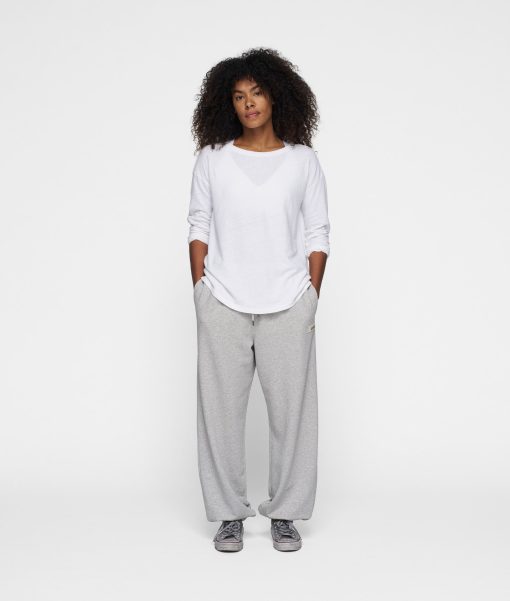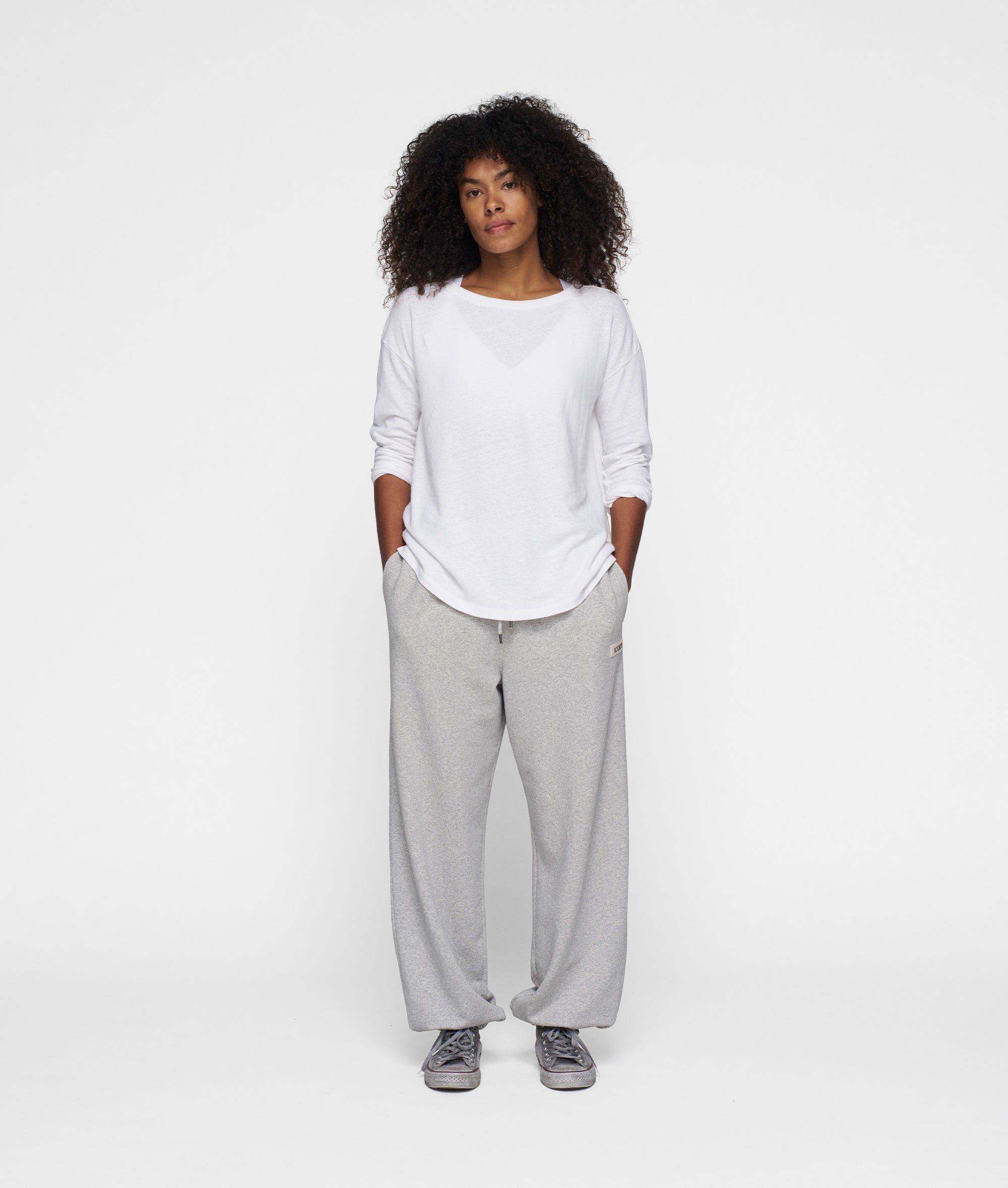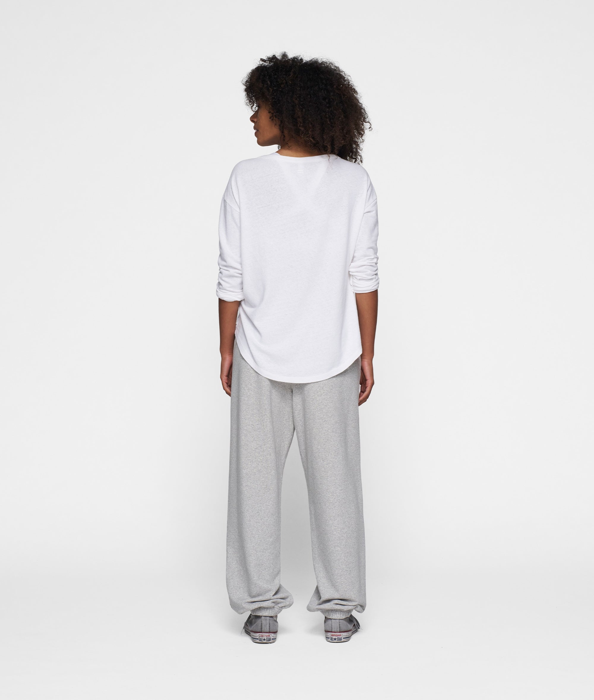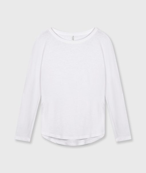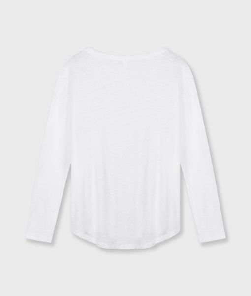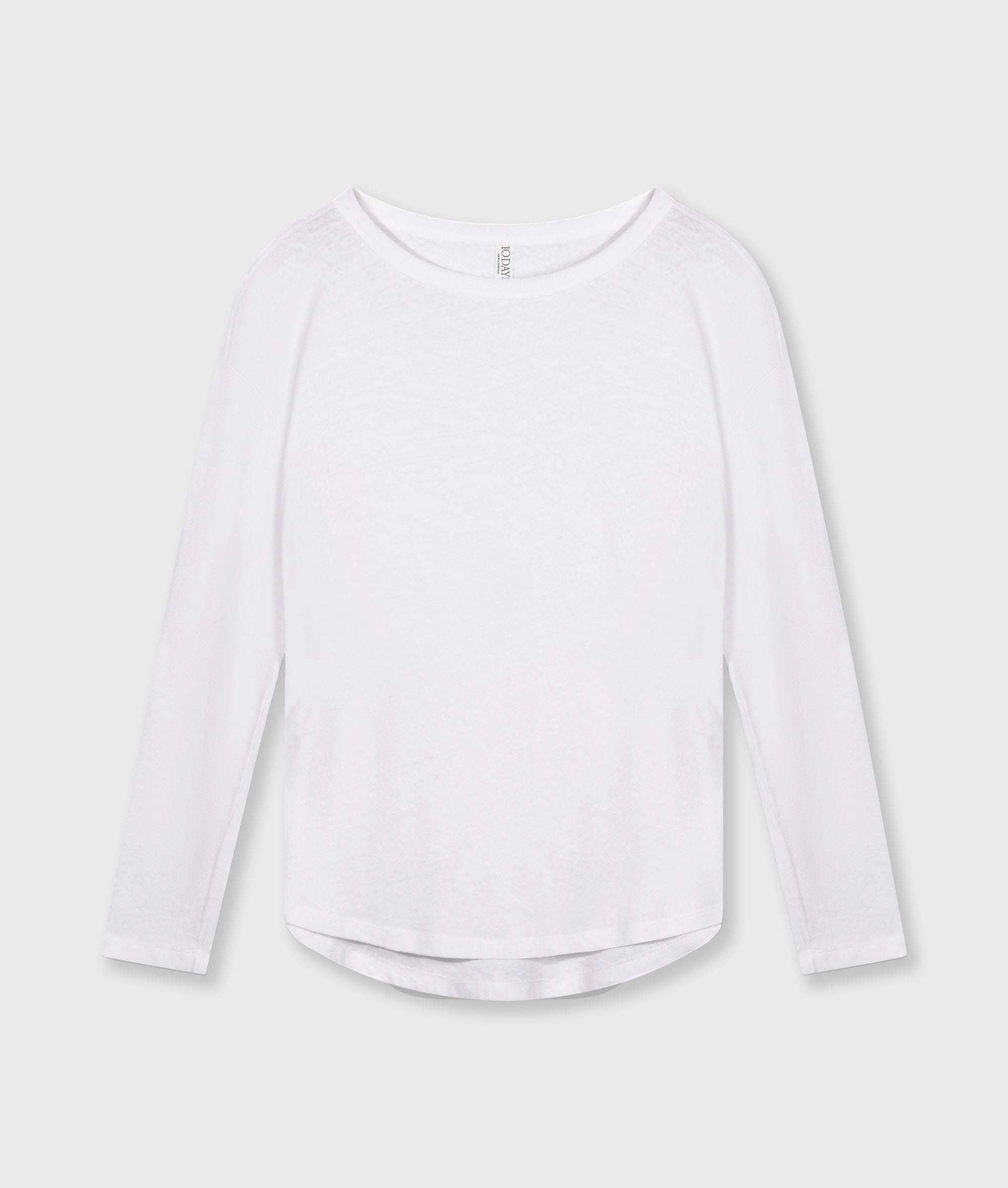 Relaxed fit long sleeve top, made of a cotton and linen blend jersey. Featuring a round neck, low sleeve insert, a round hem and a mini stripes logo embroidery on the back.|