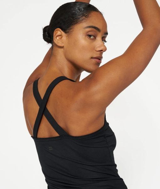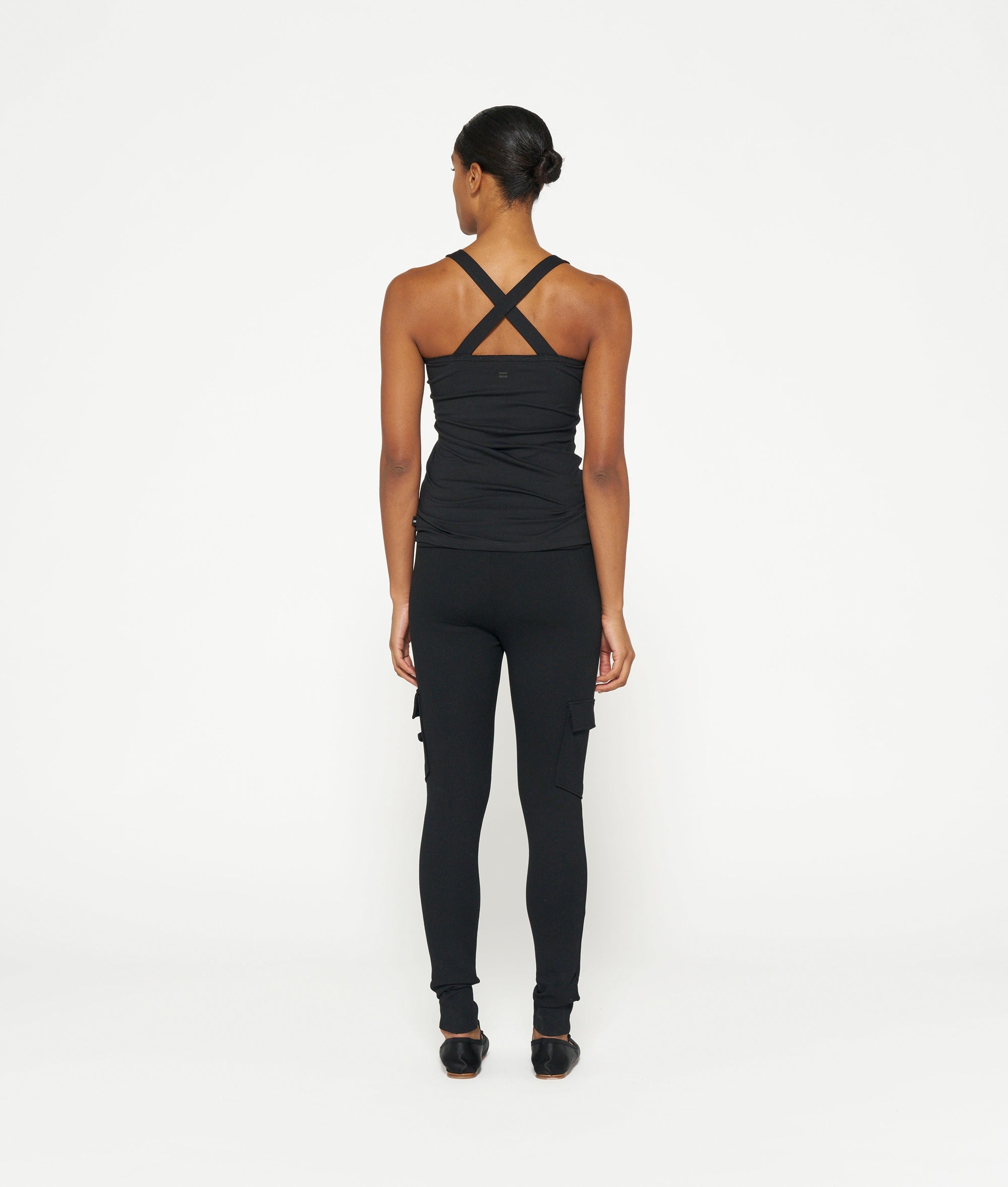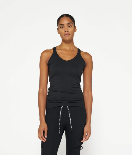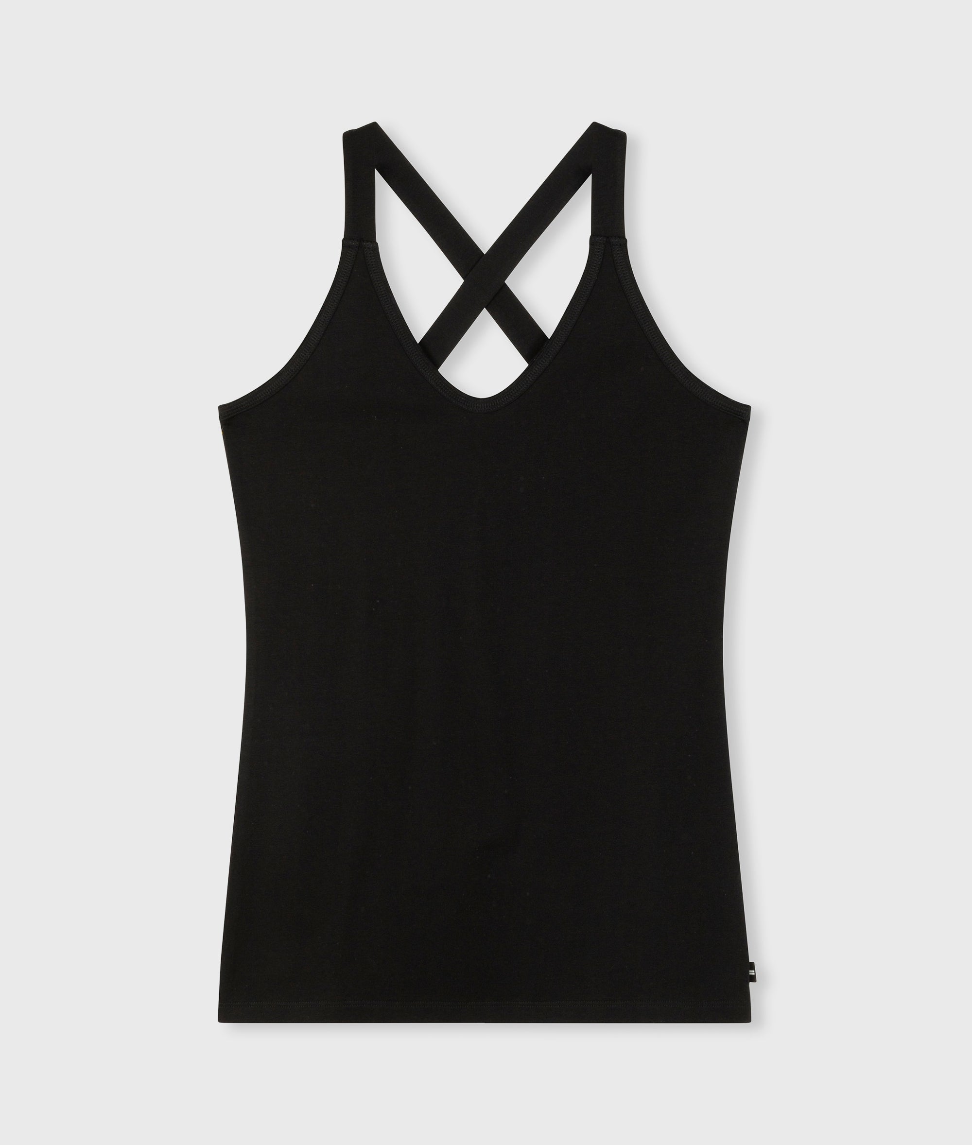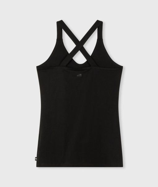 Slim fit singlet top with crossed straps at the back, made from organic cotton blend. Features a vintage finish around the neck and a mini stripes logo on the back.|
