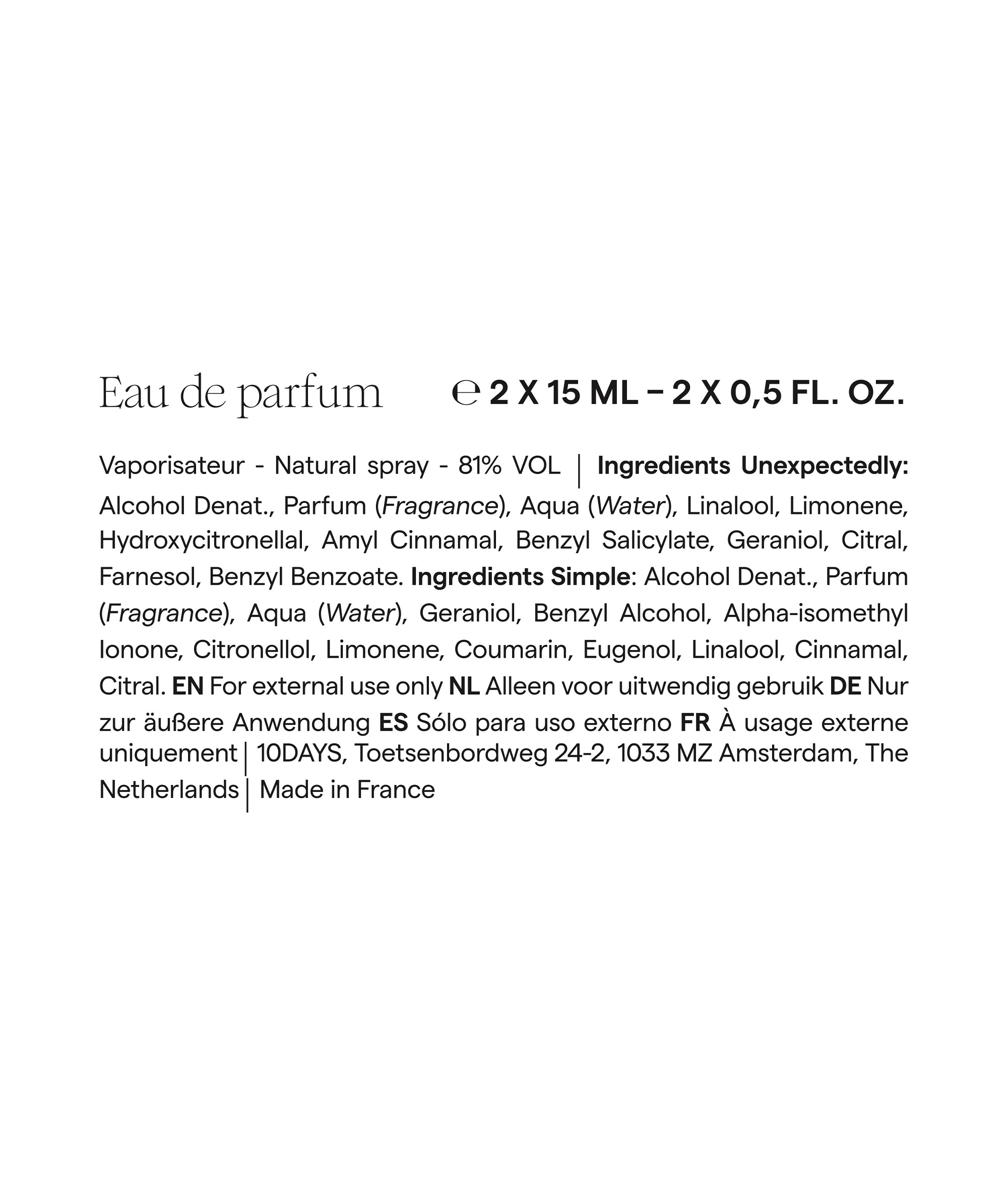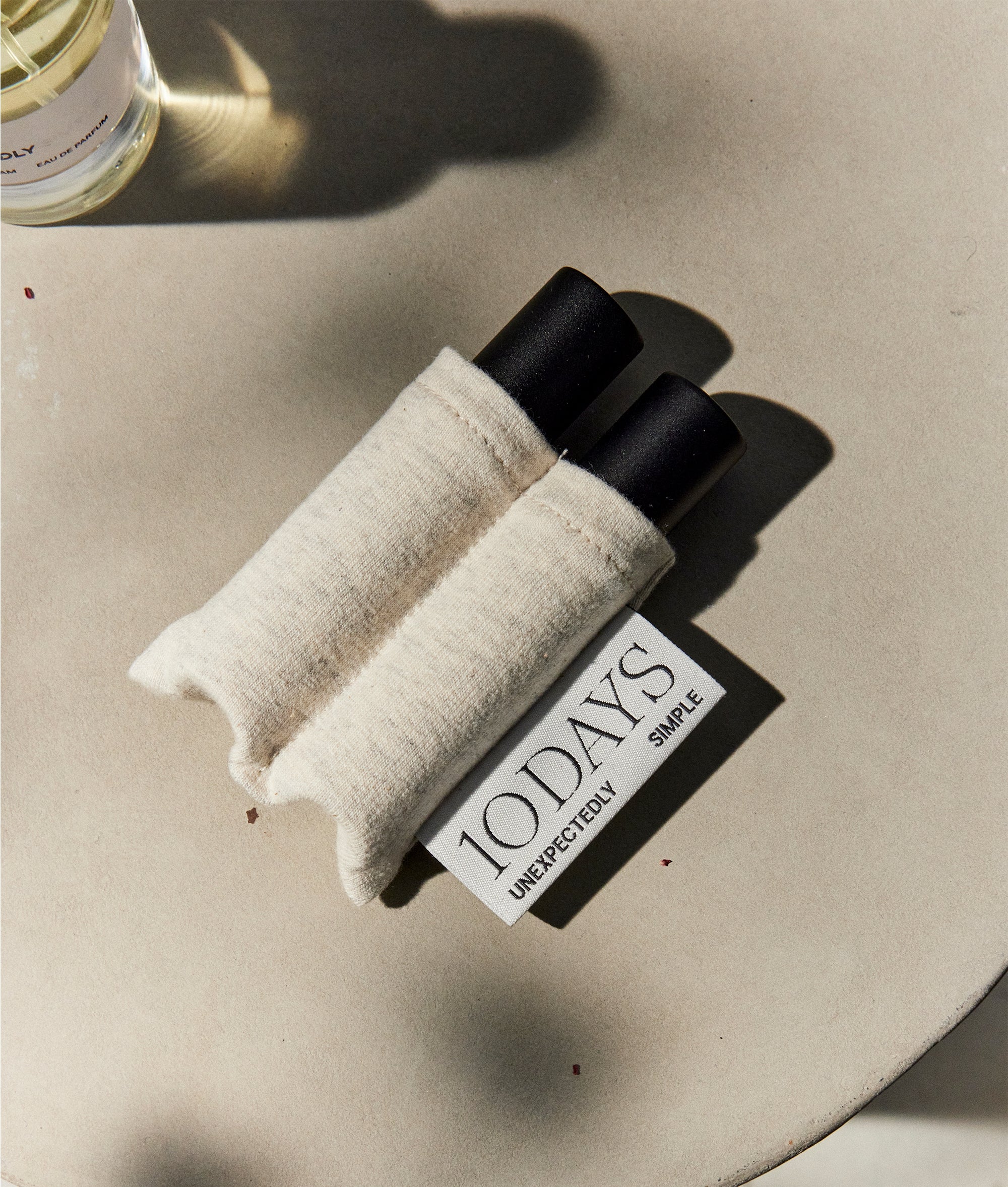 UNEXPECTEDLY SIMPLE – 2x 15ML eau de parfum travel set from 10DAYS. Embodying Amsterdam’s vibrant spirit, “UNEXPECTEDLY” bursts with dynamic energy and vibrant unpredictability, while “SIMPLE” imparts a scent of effortless elegance and intentional simplicity. Embrace the Unexpected, Celebrate the Simple.|