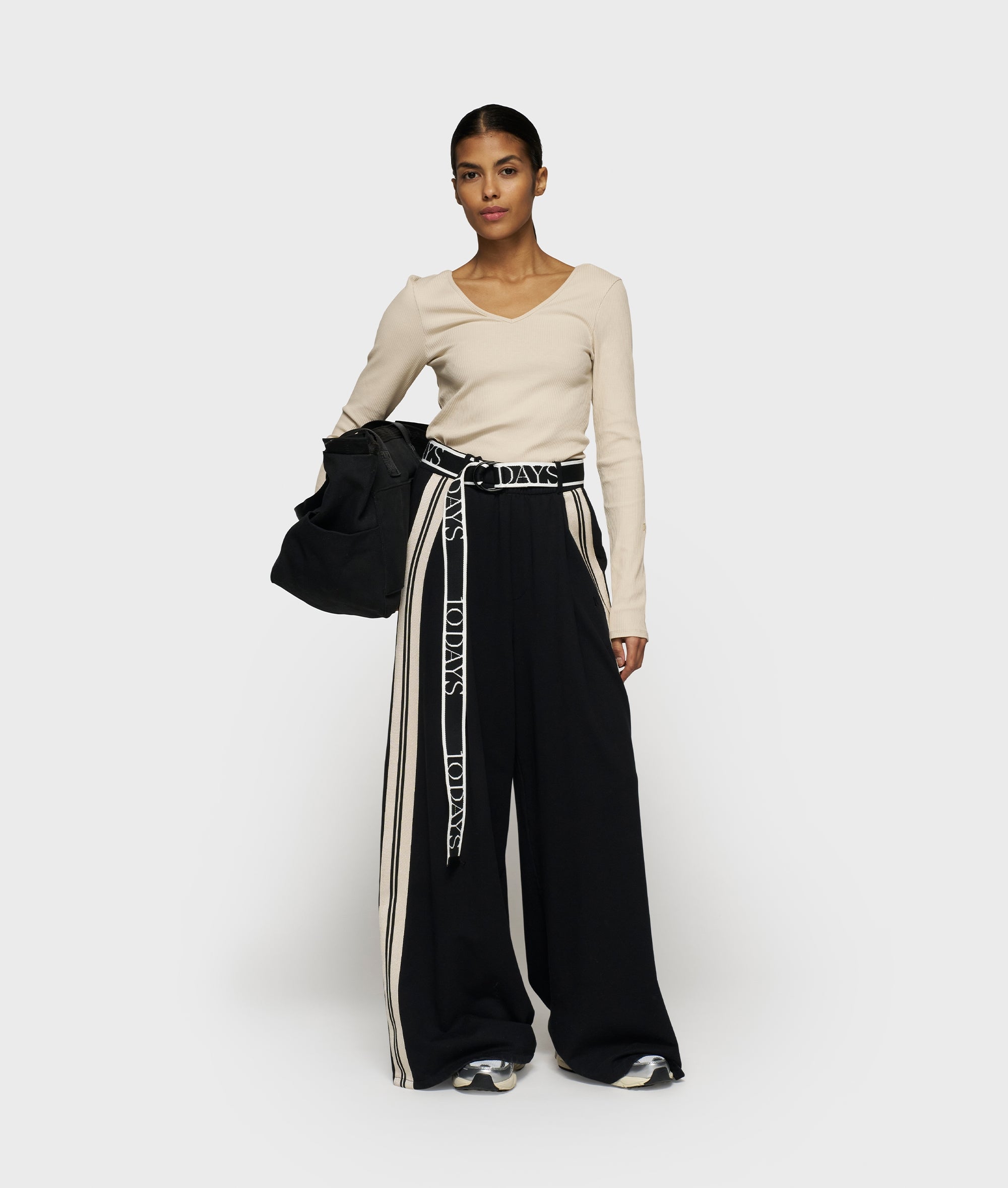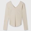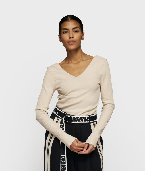 Slim fit long sleeve top made from soft GOTS-certified organic cotton rib jersey. Featuring a deep V-neckline, curved hem, monogram embroidery on the left sleeve and a mini stripes label at the hem.|