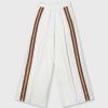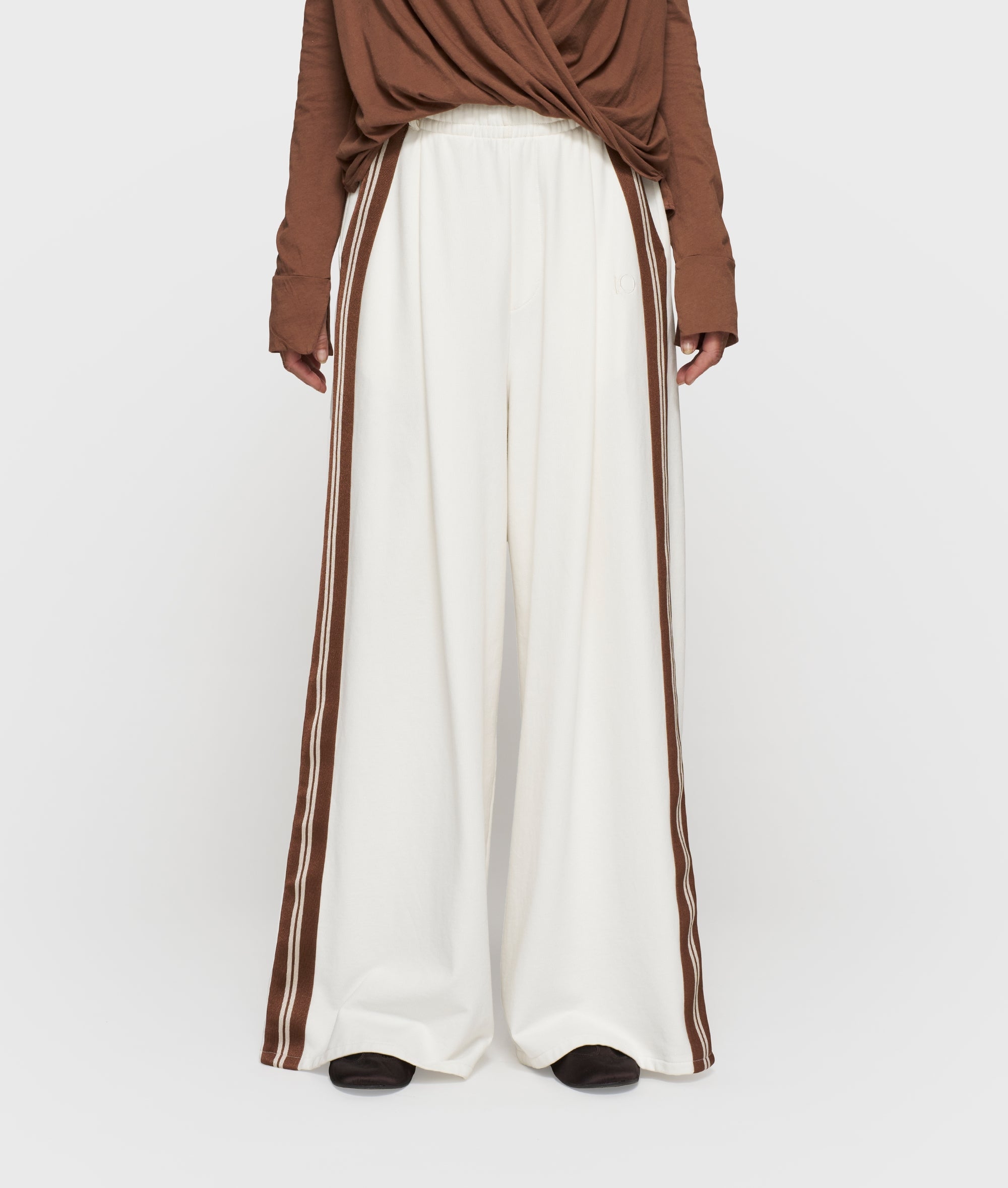 Oversized fit wide leg pants, crafted from soft cotton. Featuring a high waistband with drawstring, slanted front pockets, a faux welt pocket and a deep front pleat. Finished with striped tapes along the side seams, belt loops and the 10′ monogram embroidery on the left side. Note: Due to the use of multiple fabrics, this garment needs extra care after washing. Find more info on how to take care of your garment at the washing instructions.|